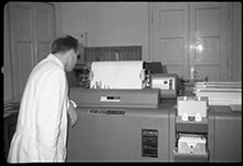 Mitarbeiter Herr Rother an der Tabelliermaschine, Bearbeitung der Auszahlung der Blindenhilfe in der Hauptverwaltung in Kassel